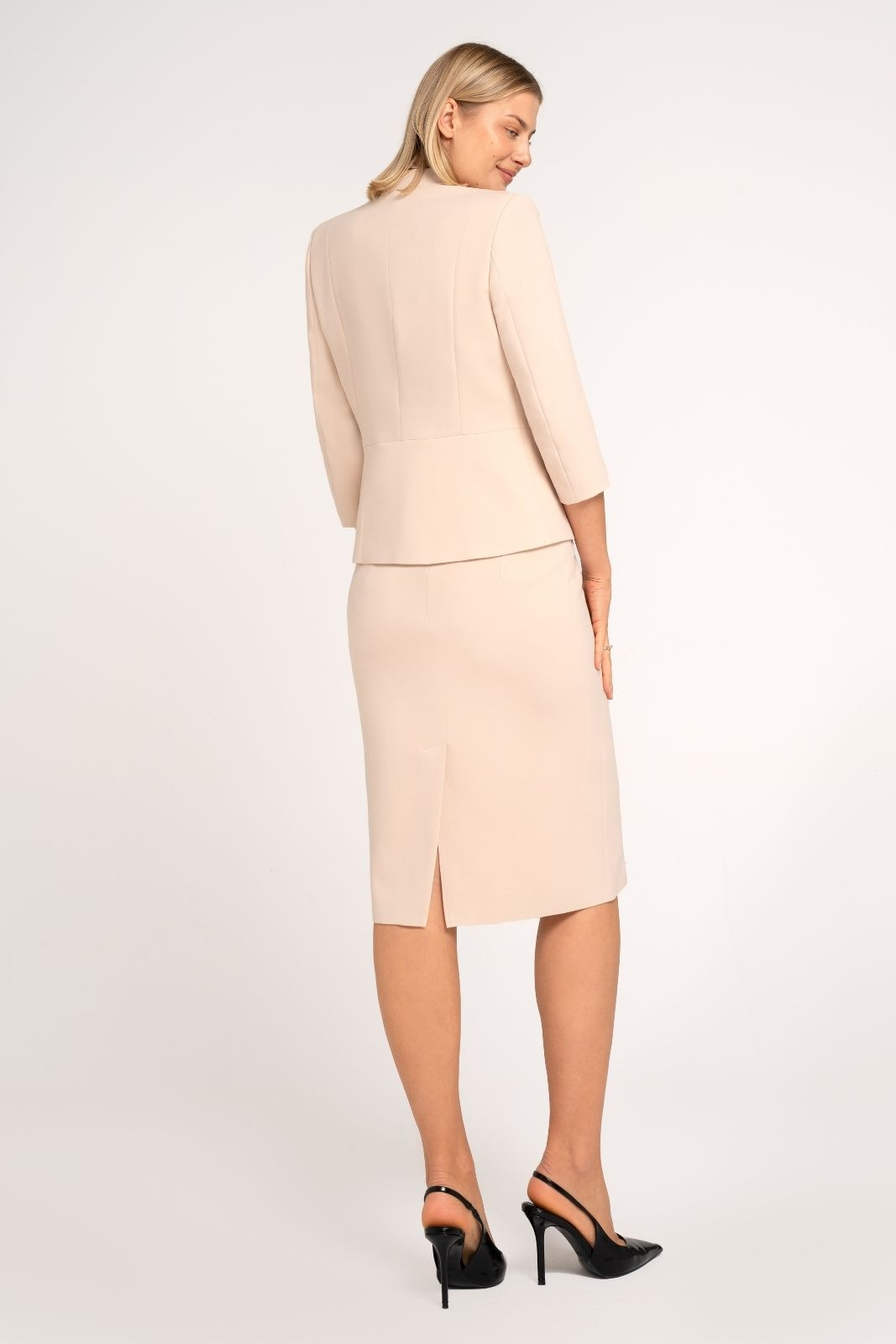 Bolerko Adele w kolorze beżowym zostało wykonane z wysokiej jakości materiału, który jest matowy, przyjemny w dotyku i odporny na zagniecenia. Elegancki fason ze stójką i subtelnym wycięciem pięknie eksponuje szyję, dodając szyku każdej stylizacji. Taliowany krój oraz pionowe cięcia optycznie wysmuklają sylwetkę, a zapinanie na jeden guzik podkreśla wizytowy charakter bolerka.