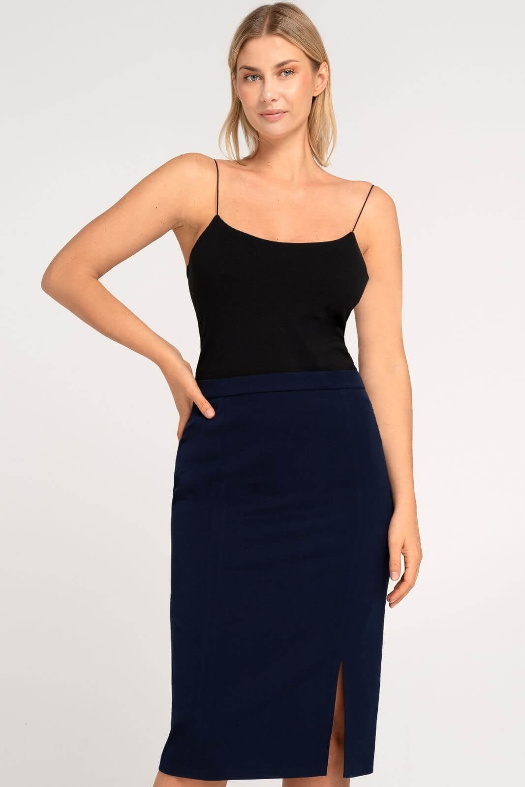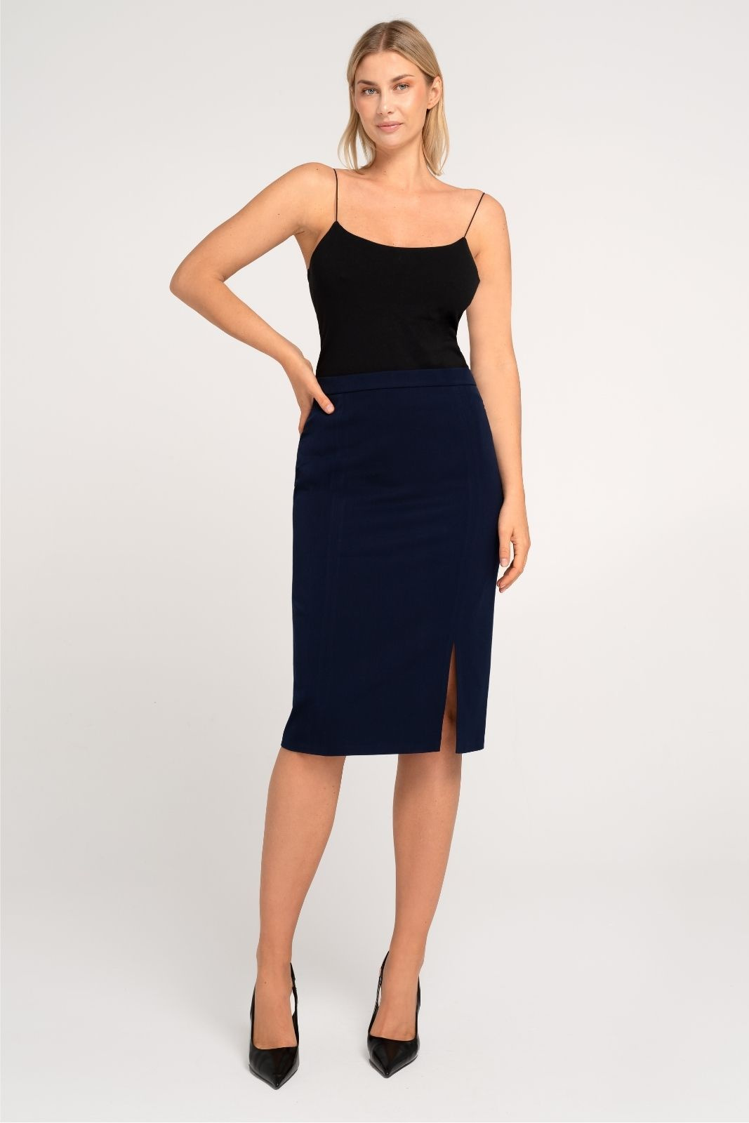 Jeśli szukasz eleganckiej i praktycznej spódnicy na wiele okazji, granatowy model midi z rozcięciem z przodu będzie doskonałym wyborem.