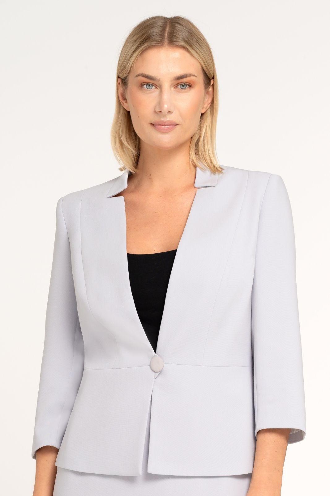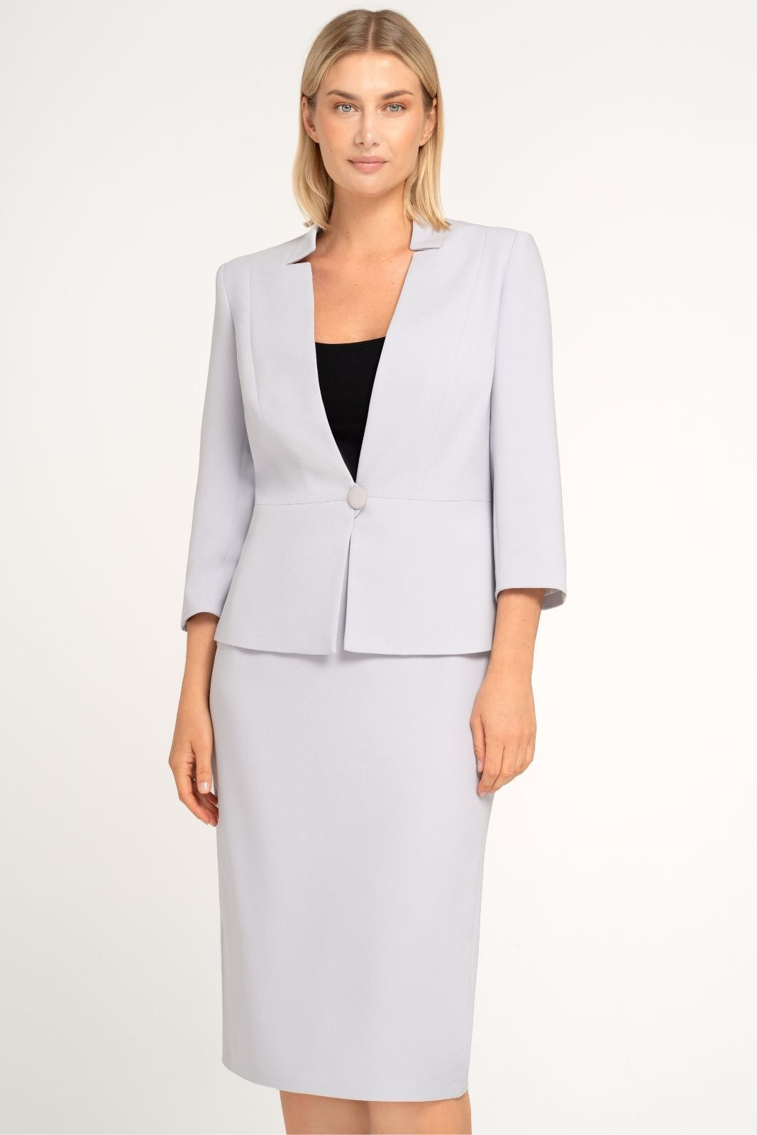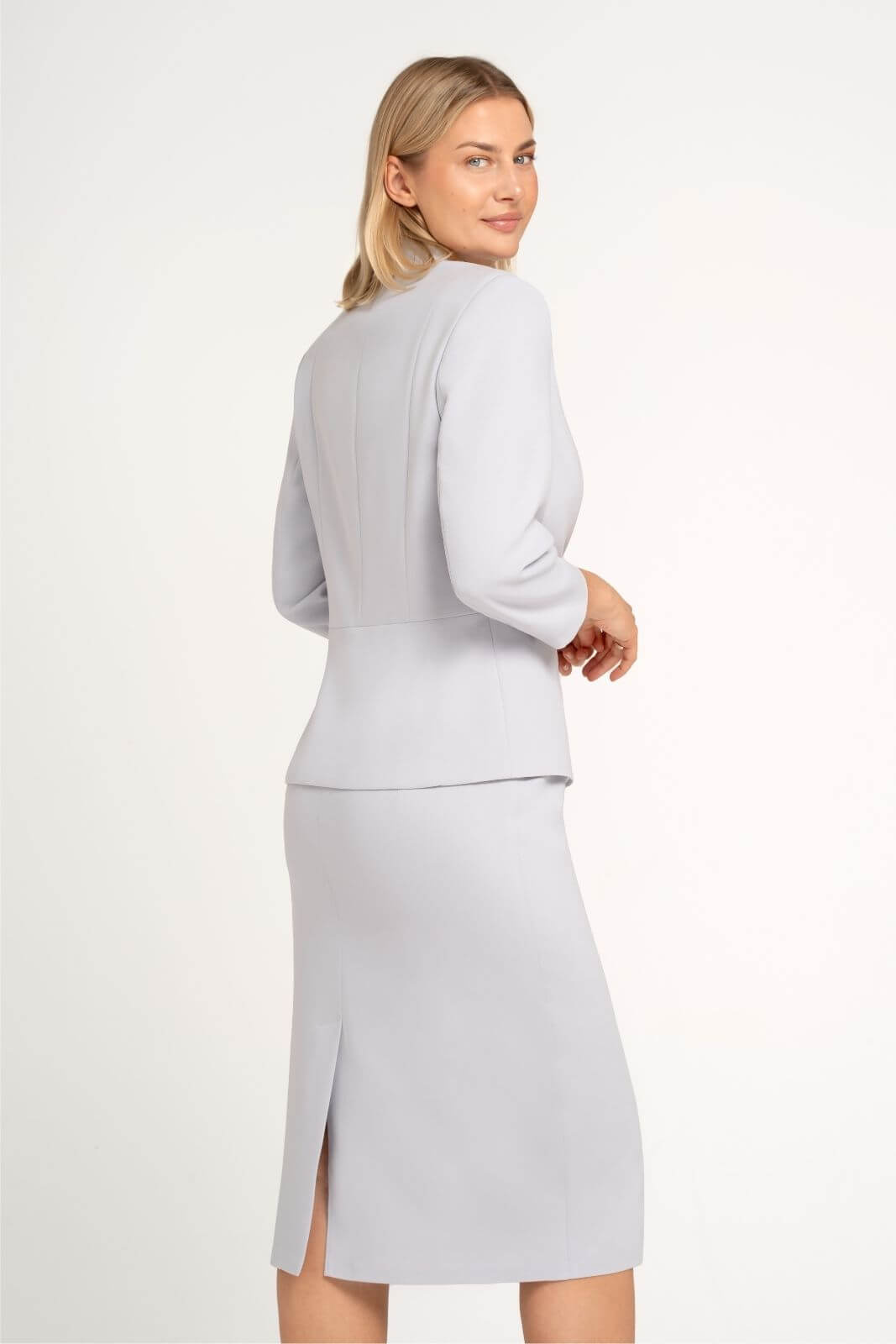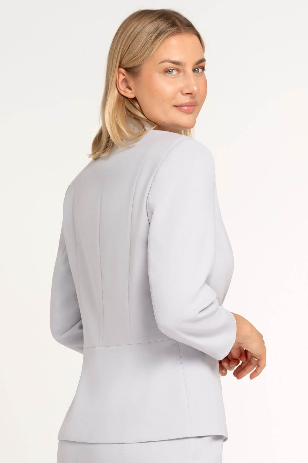 Wizytowe bolerko Adele w kolorze jasnoszarym zostało uszyte z wysokiej jakości tkaniny, która zapewnia komfort noszenia oraz doskonałe dopasowanie do sylwetki. Materiał jest matowy, miękki w dotyku i odporny na zagniecenia.
