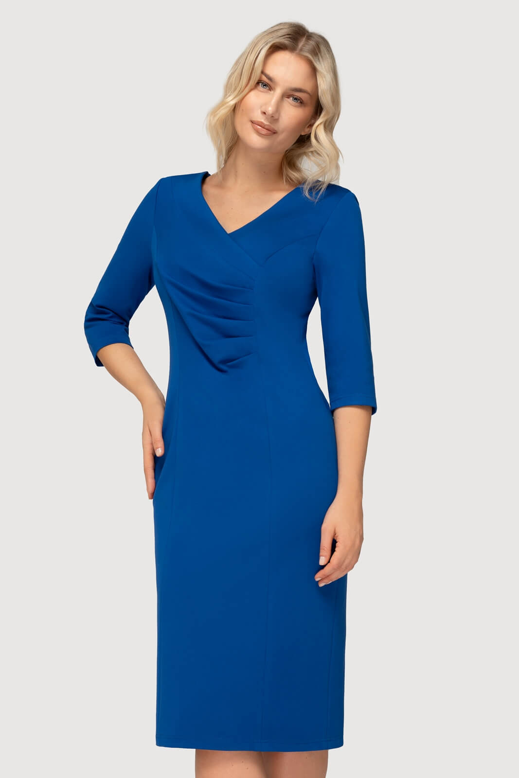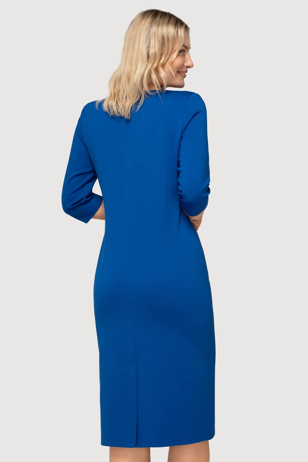 Sukienka posiada kopertowy dekolt V, doszyty do szwu przy cięciu francuskim, dzięki czemu idealnie się układa i zachowuje formę. Subtelne stebnowania przy dekolcie dodają całości klasy i podkreślają staranne wykończenie.
